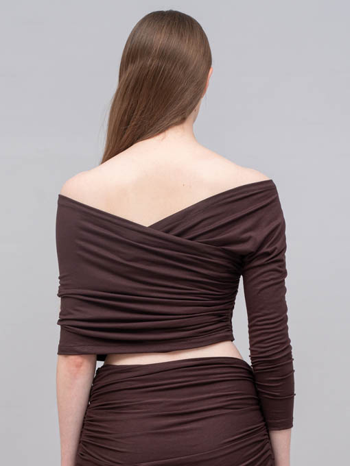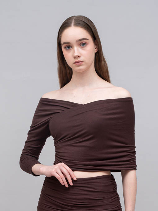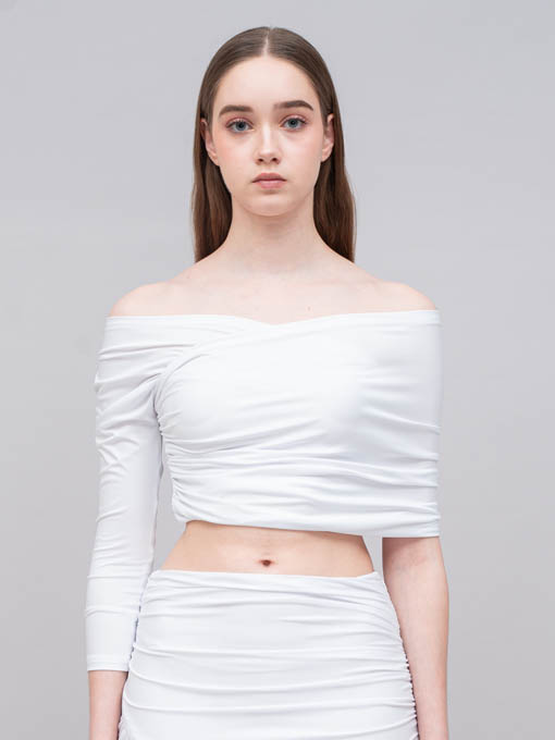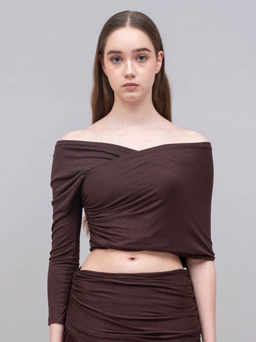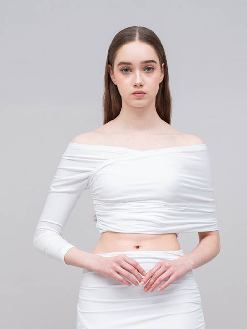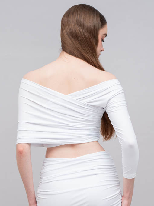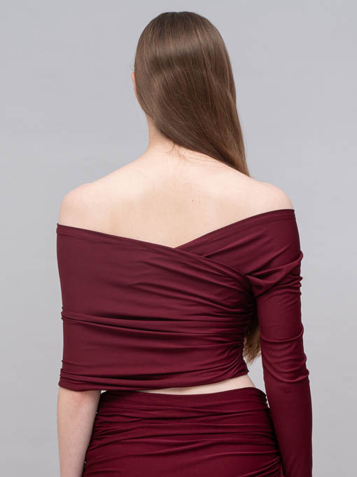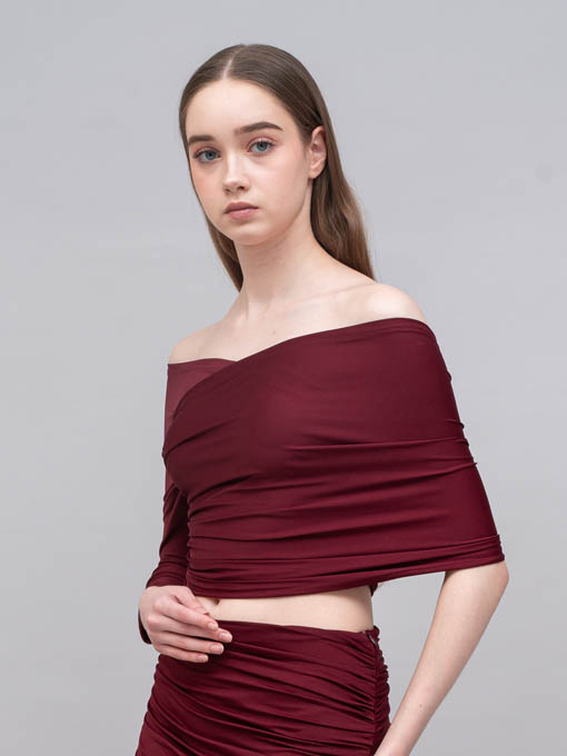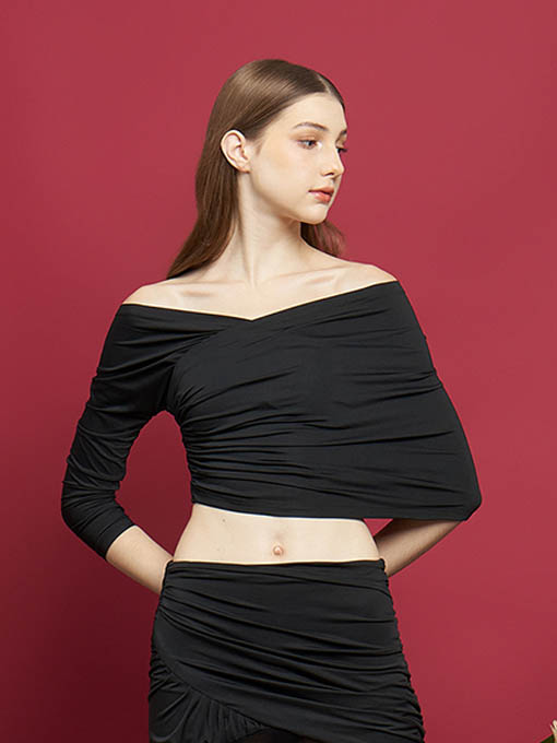 The Asymmetric Pleated Jersey Top is designed to highlight your silhouette with a bold off-shoulder asymmetric cut. Featuring one long sleeve on one side and a wrap detail on the other, this top creates a striking balance between elegance and sensuality. Made entirely from pleated jersey fabric with stretch, it offers both comfort and a sculpting fit.