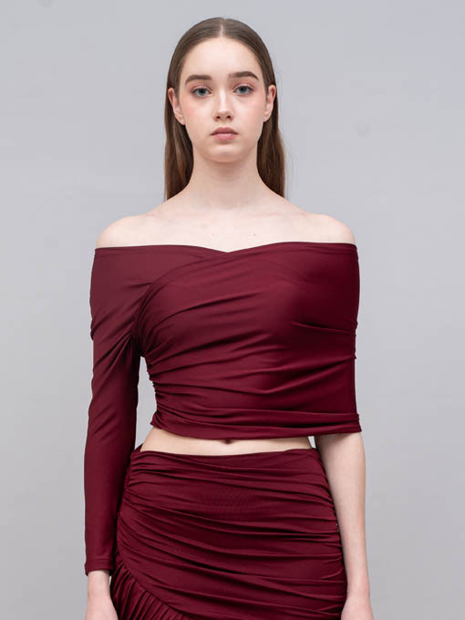 Features: Off-Shoulder Asymmetric Design, One Long Sleeve & One Wrap Detail Side, Body-Fitting Silhouette, Fully Pleated Texture